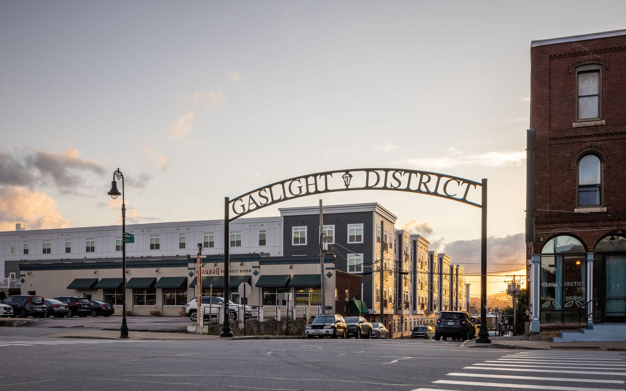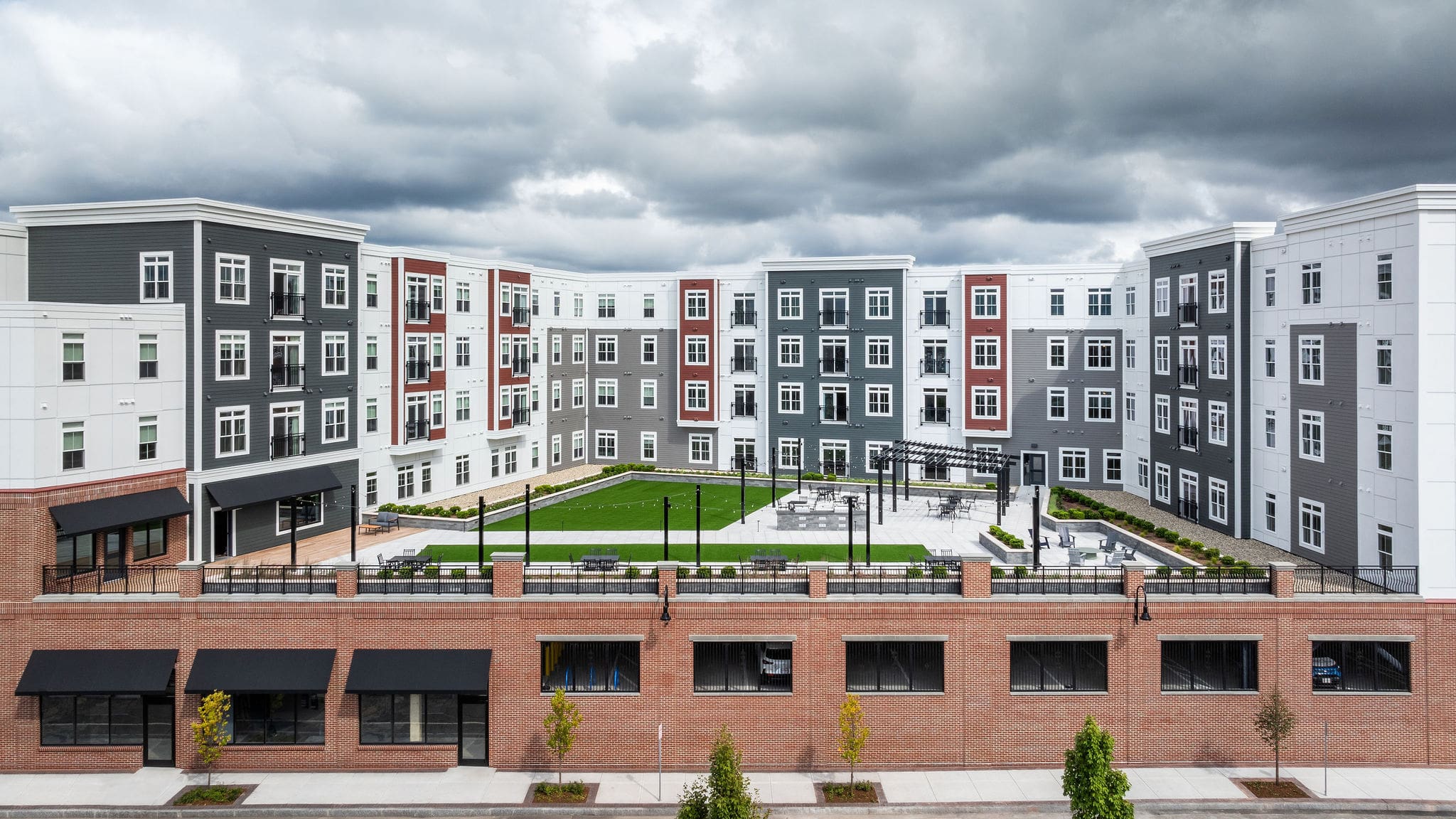 Large windows maximize natural light and offer views of the river and courtyards. Exterior elevations combine a brick base with siding to align to community-driven aesthetic goals with a cost-effective solution. Amenities include a leasing office with soaring 17-foot ceilings, a double-sided fireplace, and a rooftop event space with see-through fireplace and outdoor deck. Custom “bellied” metal fencing reflects the historic aesthetic from adjacent buildings.