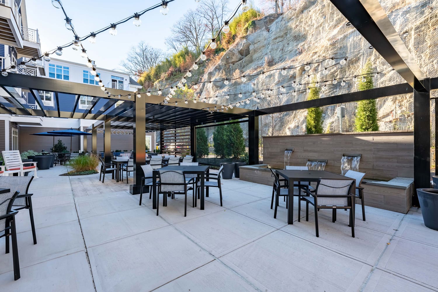 This dramatic natural backdrop is highlighted as a central design feature, and softened with thoughtful landscaping. The rock wall is a key feature of the back terrace design, lending intimate ambiance to this outdoor dining and social space.