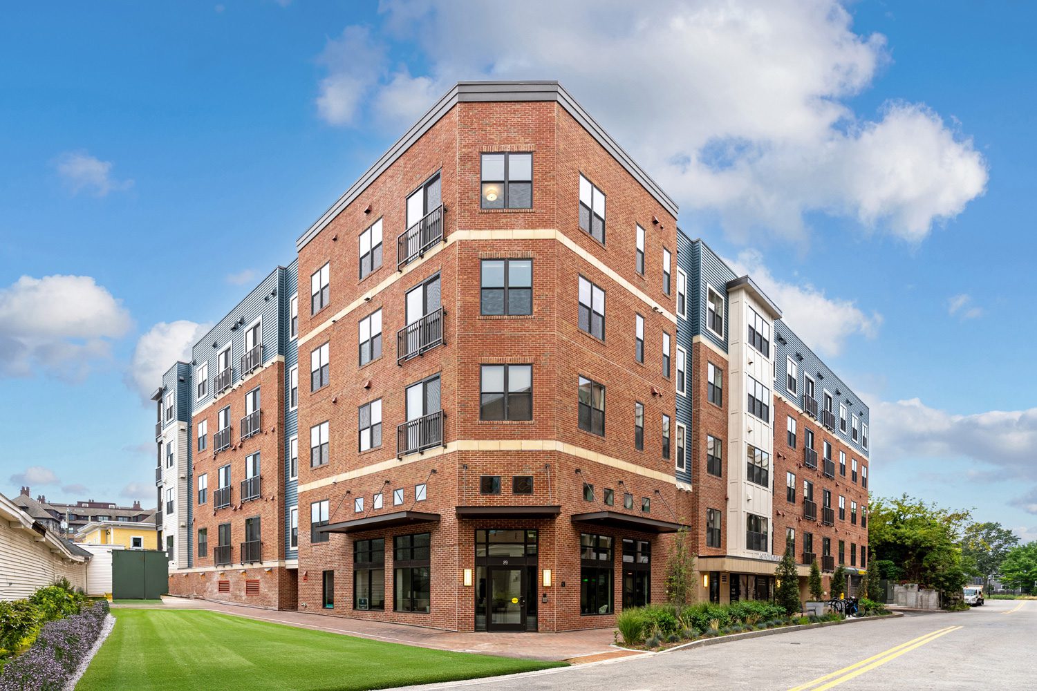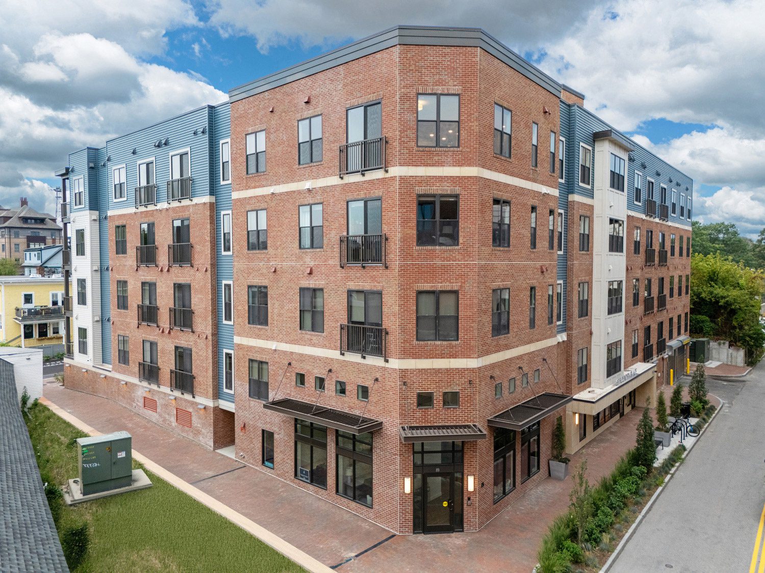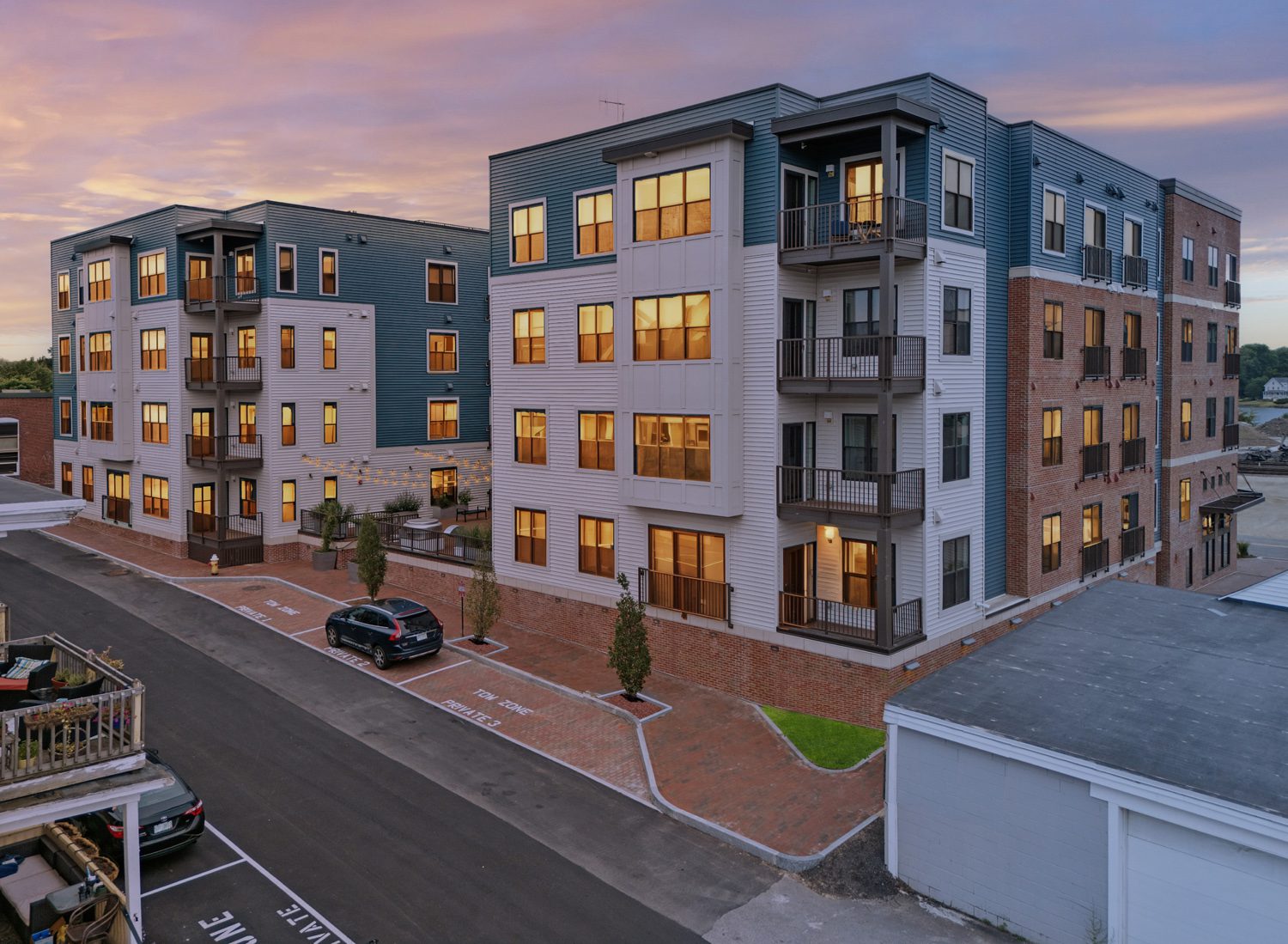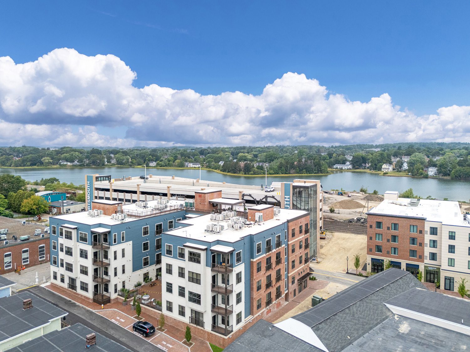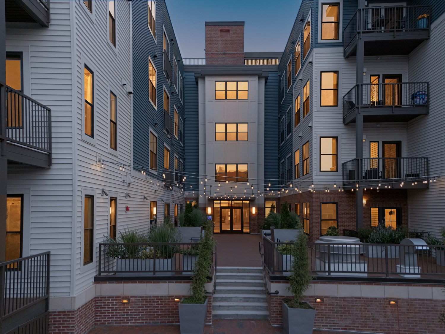 The Residences at Foundry Place includes 51 luxury condo units in a 72,900 sf, five-story building in downtown Portsmouth, NH. At the corner, a two-story commercial space includes office space, public meeting space, and a fitness center.