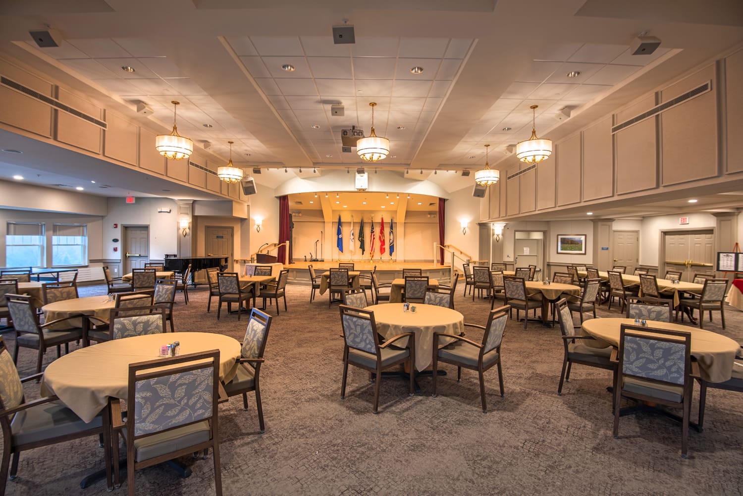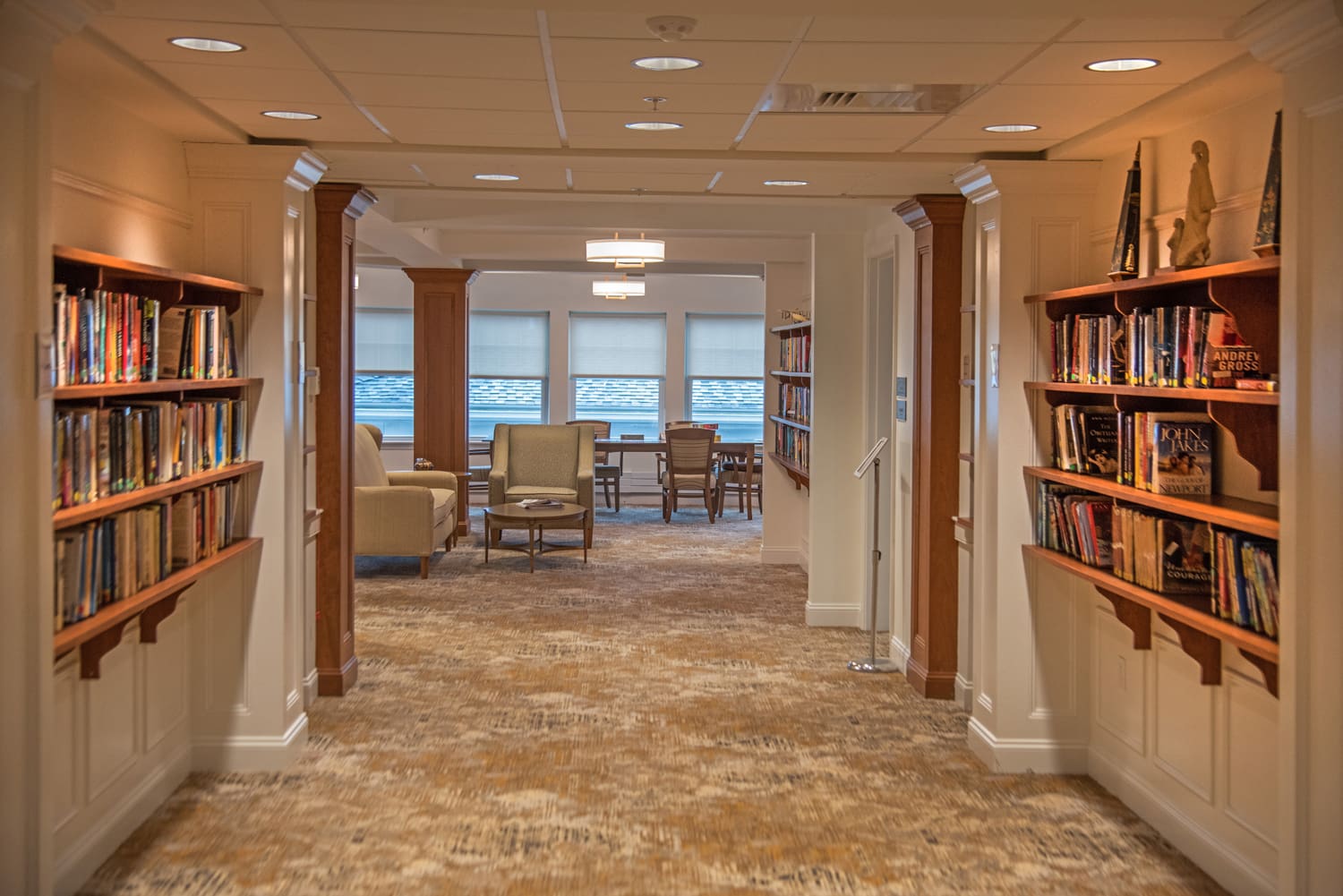 The project included converting an underutilized meeting room into an indoor/outdoor pub; enlarging the patio and adding a fire pit; converting existing offices into a new meeting space; and converting a storage space into offices. In addition, the project refreshed the theater and library; added a new arts and crafts room; renovated the fitness areas; updated the auditorium; and updated three dining rooms and three floors of corridors.