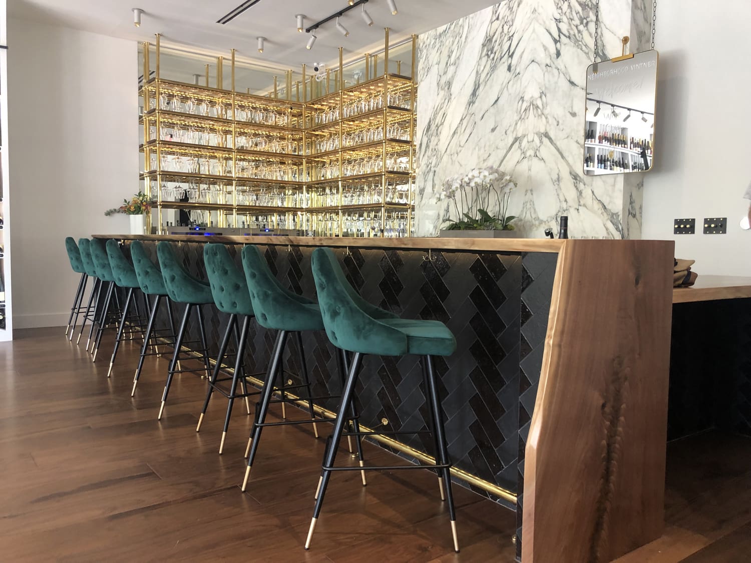 Featuring a large tasting bar, customers can enjoy wine tastings and a comfortable shopping environment. Custom wood cabinetry and décor elegantly display the shop’s extensive wine selection.