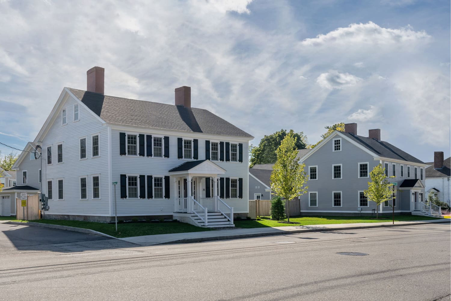 Situated at a prominent gateway to Exeter, NH, this 26,000 sf faculty housing development is located on a private K-12 academic campus. The project combines ten new construction single-family home, two-family homes, and the adaptive reuse of the historic Joshua Gilman Smith House (c. 1810). The restored historic home preserves original elements, including pocket shutters, marble fireplace mantles, and millwork, celebrating its heritage.