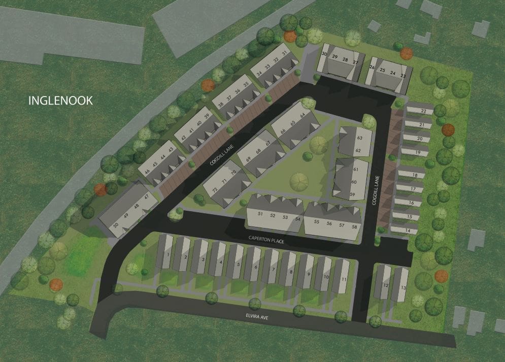 Front porches, rear-loaded garages, and shared green space define this walkable community of 72-unit townhomes.