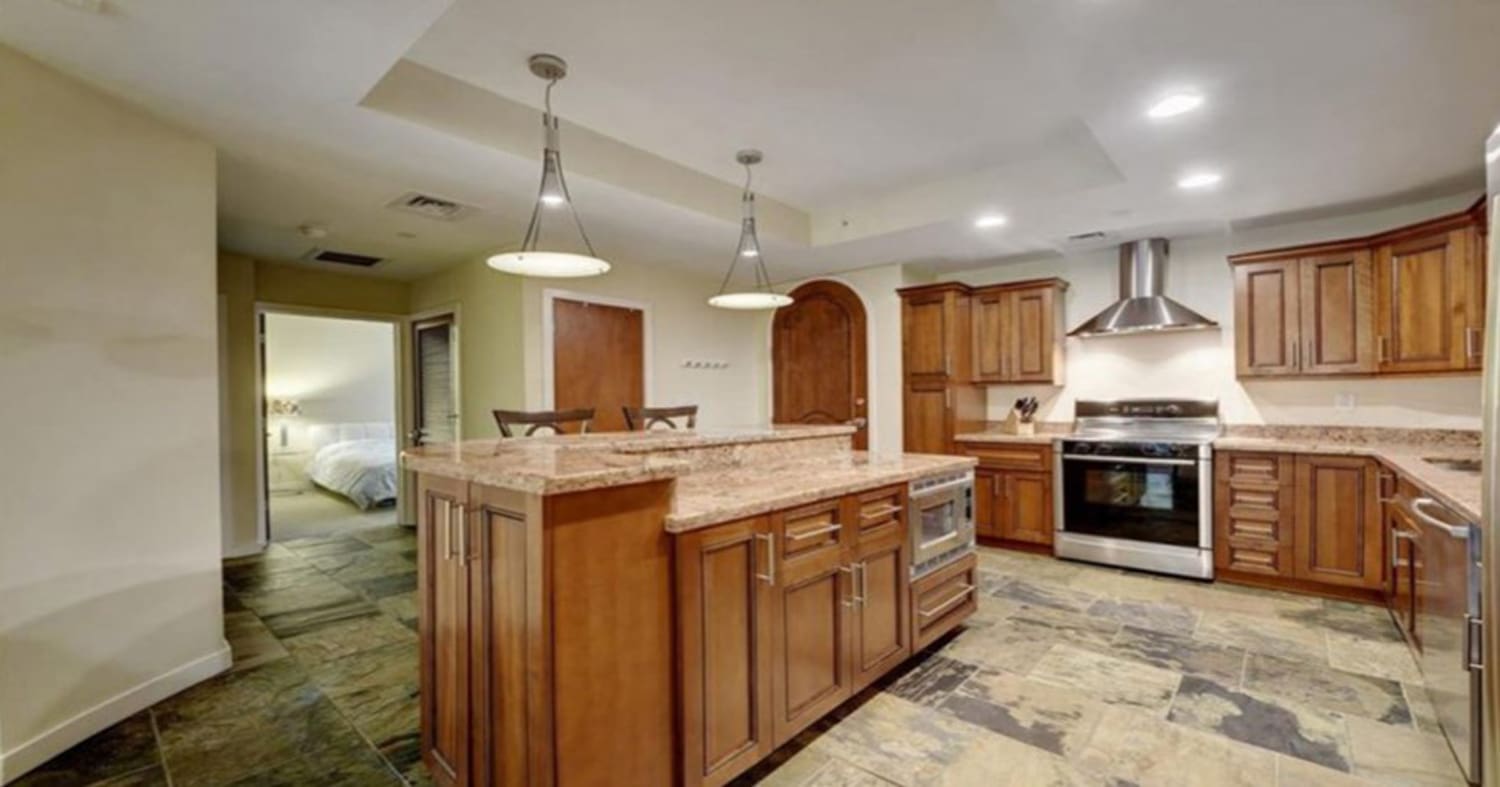 Oversized balconies allow abundant natural light to flow into large open living areas. Contemporary kitchens feature granite countertops and island bars with pendant lighting.