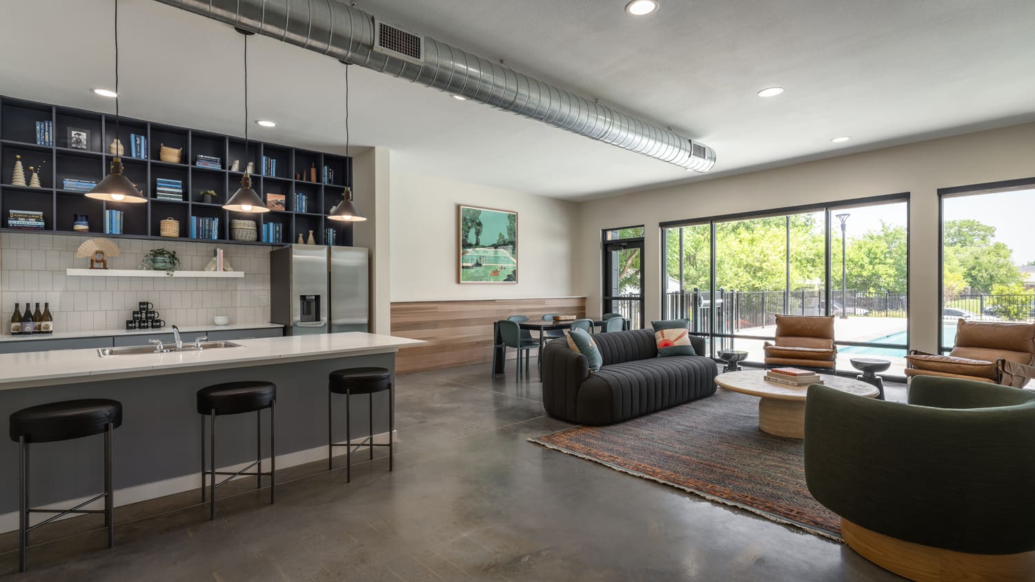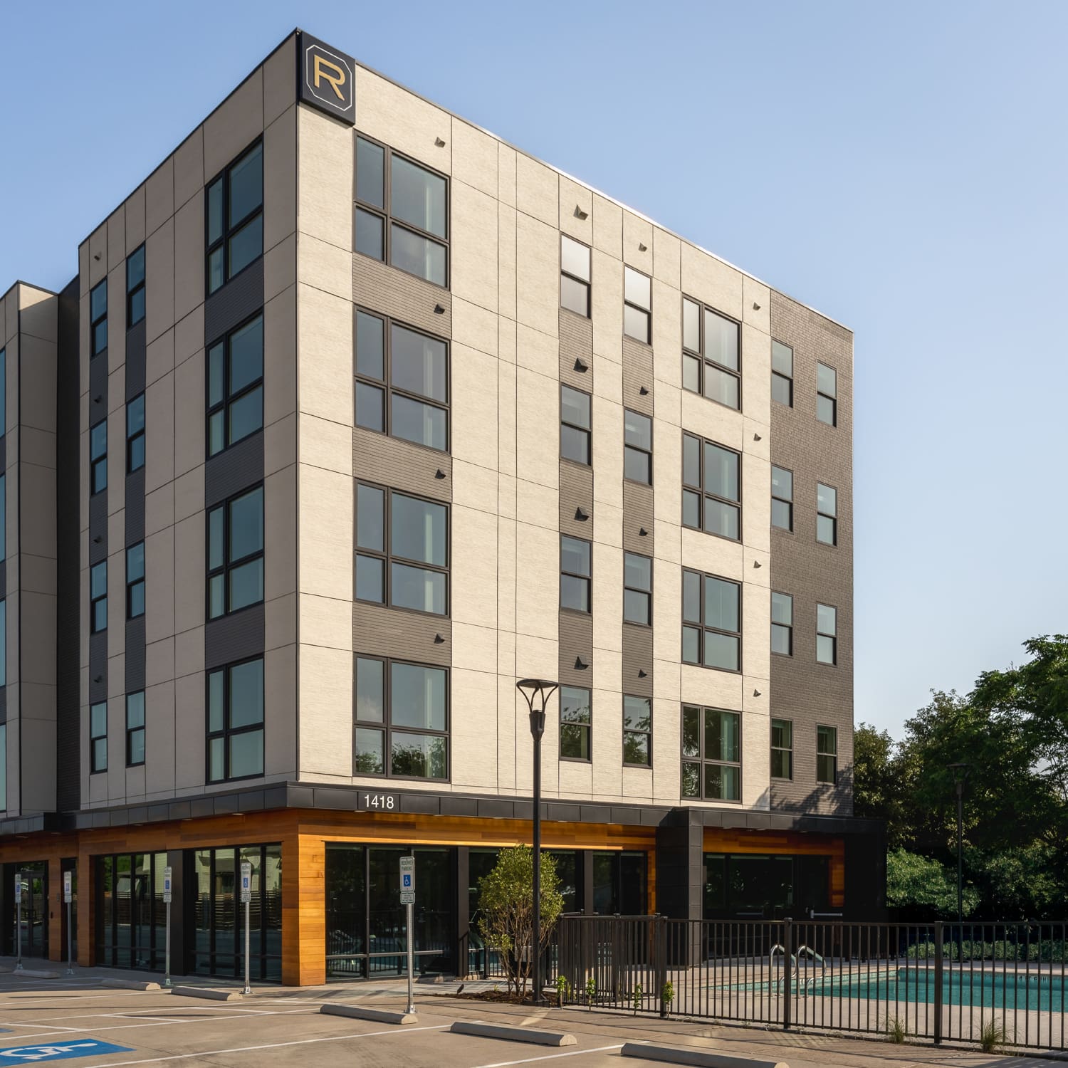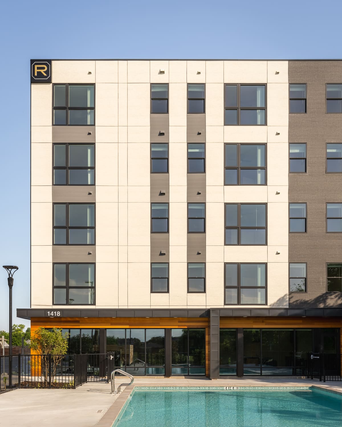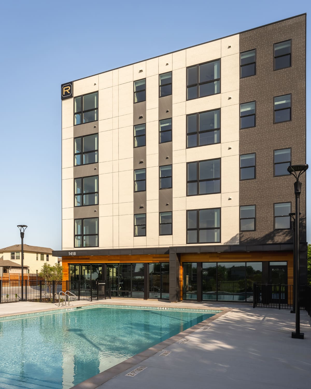 The design draws inspiration from the present-day aesthetic of Austin city-living, with exterior materials that establish a contemporary massing. A generous amenity center fosters community among residents with a lounge, fitness center, swimming pool with outdoor recreation space, and private office rooms equipped for work-remote needs.